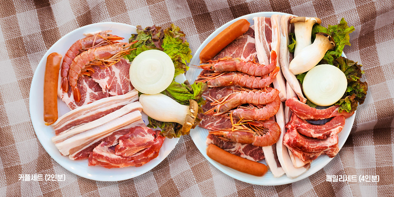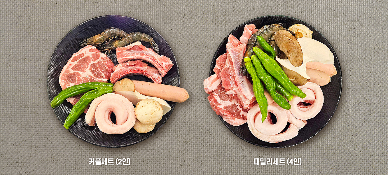 ※ 구성: 삼겹살400g, 목살400g, 돈등갈비4쪽, 소세지2개, 새우4마리, 된장찌개 + 샐러드바 무료 + 모둠채소세트 1개 제공
