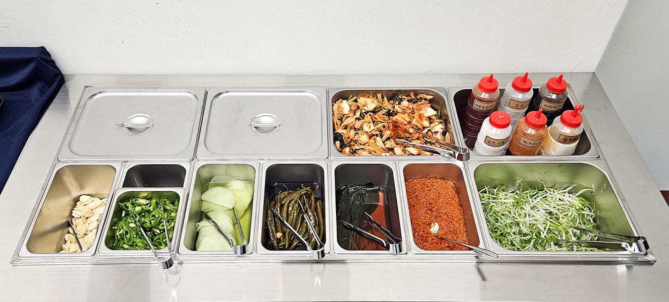 샐러드바 이용- 구성 : 파절이, 쌈장, 명이나물, 고추장아치, 쌈무, 고추, 마늘, 김치, 참기름, 굵은소금, 파절이 양념소스, 후추, 매운맛 닭꼬치 소스, 데리야끼 소스